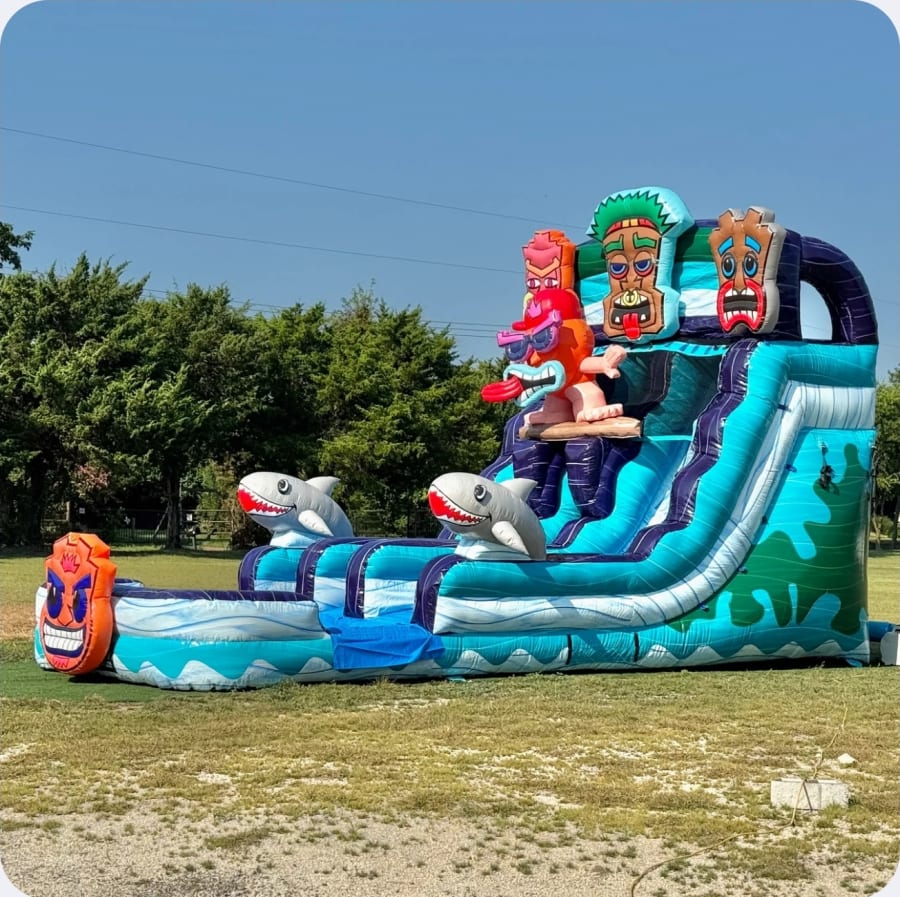 Don't wait any longer to elevate your event with the thrill of our 17Ft Tiki Surfer Dual Lane Waterslide! Contact us today to reserve this exciting attraction for your upcoming gathering and get ready to make a splash!